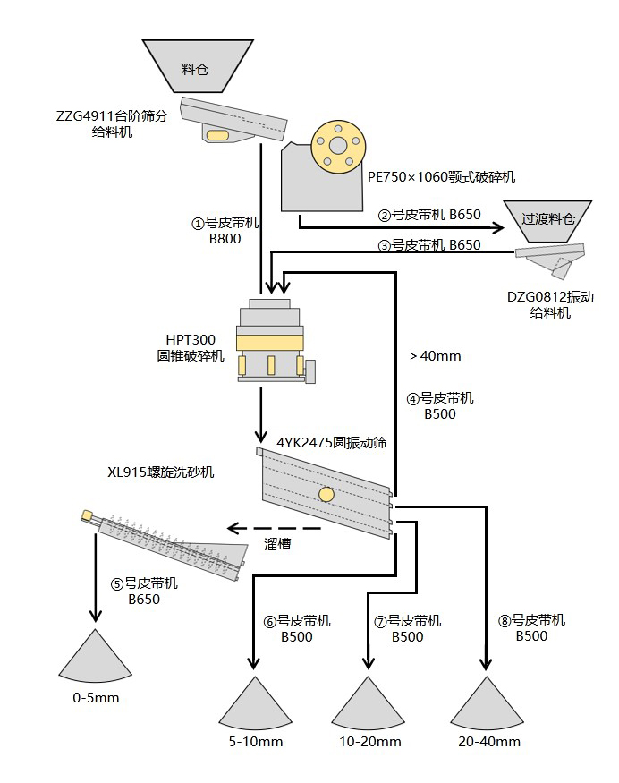 原料運(yùn)輸車或者鏟車把原料倒入料倉(cāng),通過(guò)臺(tái)階篩分振動(dòng)給料機(jī)均速均勻的把物料送進(jìn)顎式破碎機(jī),臺(tái)階篩分振動(dòng)給料機(jī)篩分出來(lái)的小的物料直接經(jīng)過(guò)溜槽進(jìn)入到過(guò)渡料倉(cāng),減少顎式破碎機(jī)的工作量。經(jīng)過(guò)顎式破碎機(jī)破碎的物料進(jìn)入到過(guò)渡料倉(cāng),物料經(jīng)過(guò)過(guò)渡料倉(cāng)下面的振動(dòng)給料機(jī),把物料再勻速的送入到圓錐破碎機(jī)里面,振動(dòng)電機(jī)加變頻,可以控制給料量的大小,保證圓錐破碎機(jī)安全穩(wěn)定高效的工作,經(jīng)過(guò)圓錐破碎機(jī)破碎后的物料進(jìn)行篩分,大的物料返回圓錐破進(jìn)行二次破碎,5-10mm,10-20mm,20-40mm成品直接進(jìn)入料堆,0-5mm進(jìn)入;螺旋洗砂機(jī)進(jìn)行洗砂。