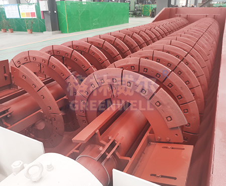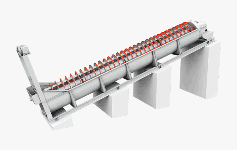 機器轉(zhuǎn)子采用中心結(jié)構(gòu),螺旋葉片安裝在中心軸上,有減速機連接到中心軸上進行工作。借助固體顆粒的比重不同,因而在液體中沉降得速度不同的原理,進行機械分級。洗砂時,主要通過螺旋部件的旋轉(zhuǎn),使砂料得到不斷的翻攪,從而使附著在砂料上面的泥土溶到水里面,泥水及其他干草等雜質(zhì)隨著水從上部的溢流口流走,砂料被不斷的旋轉(zhuǎn)從另一端的出口排出,從而實現(xiàn)了砂石料的清洗篩選。