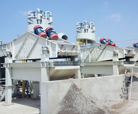 泵將砂水混合物輸送到離心分離器,離心分級(jí)濃縮的細(xì)砂經(jīng)沉砂嘴提供給振動(dòng)篩,經(jīng)振動(dòng)篩脫水后,細(xì)砂與水分離,少量細(xì)砂、泥等經(jīng)返料箱再回到清洗槽,清洗槽液面過高時(shí),經(jīng)出料口排出。直線脫水篩回收物料重量調(diào)節(jié)細(xì)度模數(shù)可通過改變砂泵轉(zhuǎn)速、改變砂漿嘗試、調(diào)節(jié)溢流水量、更換排砂嘴來實(shí)現(xiàn)。從而完成清洗、脫水和分級(jí)三種功能。
