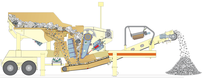 輪胎移動(dòng)式破碎站主破碎設(shè)備歐版顎式破碎機(jī)、深腔顎式破碎機(jī),物料由裝載機(jī)送入料倉(cāng),落入給料機(jī),一部分細(xì)料經(jīng)喂料機(jī)的篦條落入出料皮帶,送到料堆,大料經(jīng)過(guò)給料機(jī)振動(dòng)均勻給料送入顎式破碎機(jī),經(jīng)過(guò)破碎的物料落入皮帶機(jī),然后送入其他移動(dòng)式破碎篩分設(shè)備,完成初步的粗碎作業(yè)。